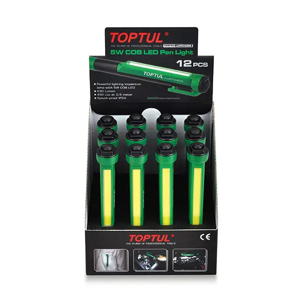 Bộ bút đèn LED 5W 12 món TOPTUL JJAT0405S là một sản phẩm hoàn hảo dành cho các thợ sửa chữa, kỹ thuật viên và những ai thường xuyên làm việc trong môi trường tối hoặc thiếu ánh sáng. Với 12 món bút đèn LED mạnh mẽ và tiết kiệm điện năng, bộ sản phẩm này không chỉ mang lại ánh sáng rõ ràng mà còn đảm bảo độ bền cao và tính tiện dụng trong quá trình sử dụng.
