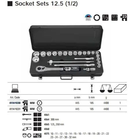 – Các socket size: 10mm – 11mm – 12mm – 13mm – 14mm – 15mm – 16mm – 17mm – 18mm – 19mm – 20mm – 21mm – 22mm – 23mm – 24mm – 27mm – 30mm – 32mm. - Trọng lượng: 4400g.