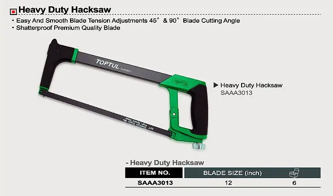 – Công dụng: Cưa sắt L1 = 12 ” Toptul SAAA3013 chuyên dùng để cưa, cắt các loại nguyên vật liệu như gỗ, sắt, nhôm, ống nhựa,…