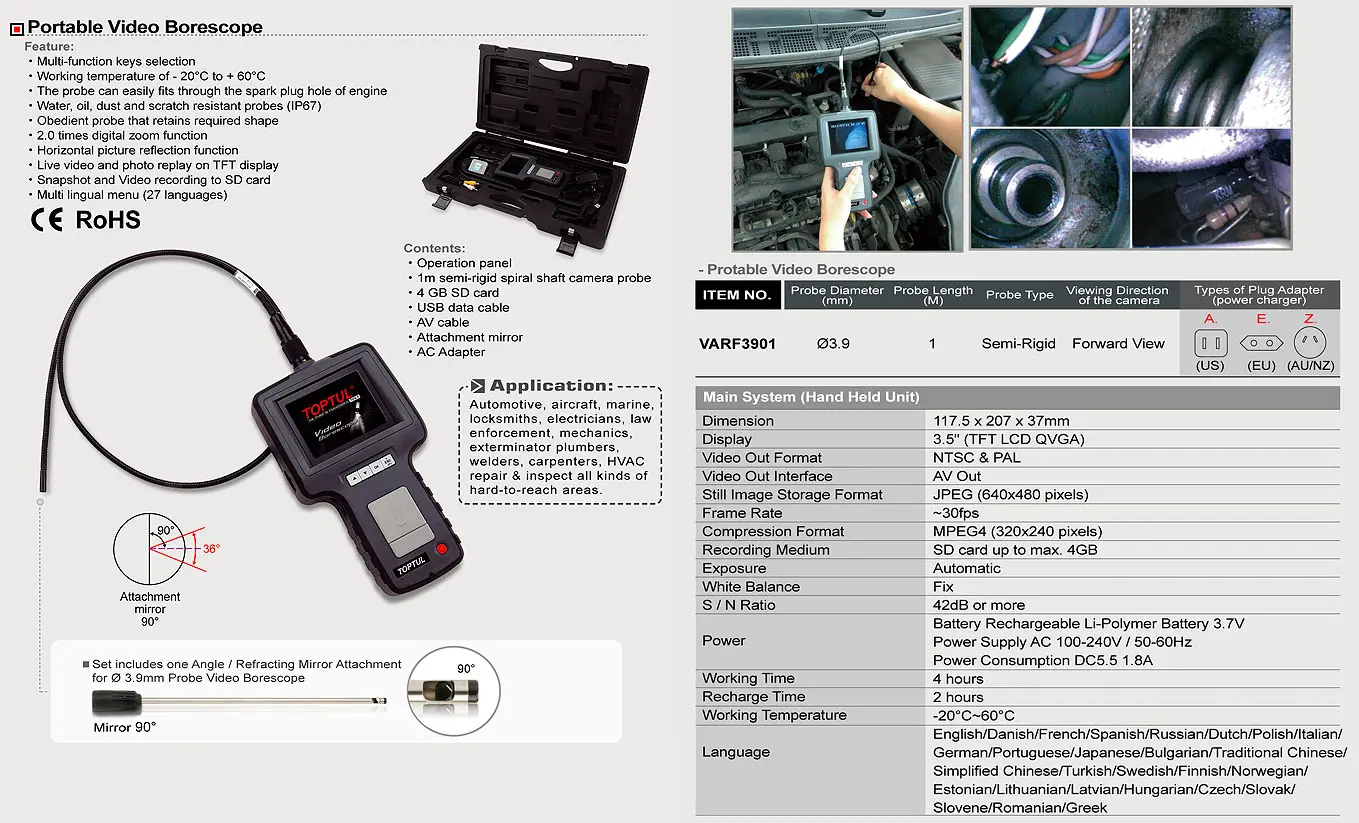 Dụng cụ nội soi sửa chữa TOPTUL VARF390 : Dụng cụ này rất hữu ích trong việc kiểm tra động cơ, hệ thống ống dẫn, máy móc công nghiệp và nhiều ứng dụng khác, cho phép tiết kiệm thời gian và chi phí sửa chữa.